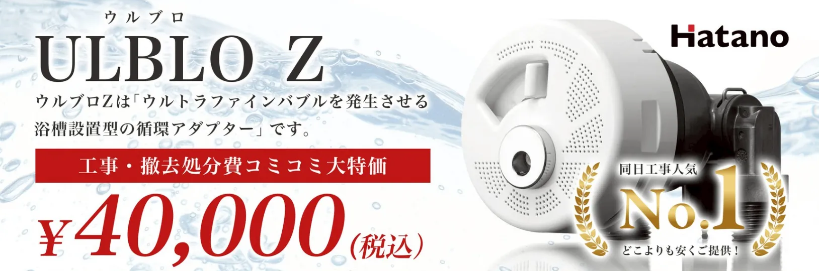 | ①ULBLO Z(ウルブロZ) | おふろに専用の循環アダプターを設置するだけ。2,800万個/mLのウルトラファインバブルで潤うお風呂へ | 40,000円 |