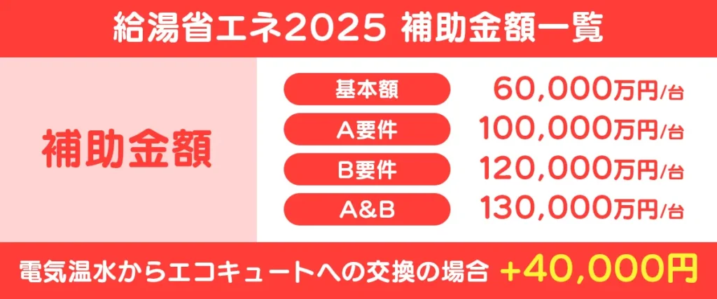 2025年現在はA要件で10万円。電気温水器からエコキュートに交換した場合+4万円。
