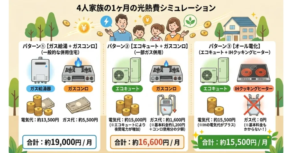 エコキュートなどの省エネ設備を導入しつつ、キッチンだけはガスコンロを残す「ガス併用(一部電化)」という選択肢ですね。