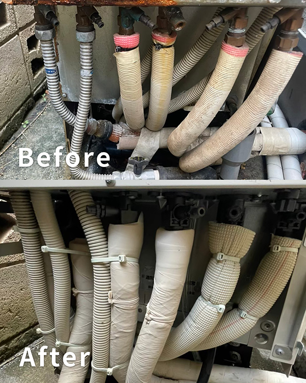 経年によりすでに一部の配管カバーが外れてしまっている状態でしたが、弊社が使用しているエコキュート専用の配管で細かい部分までしっかりと修繕いたしました。