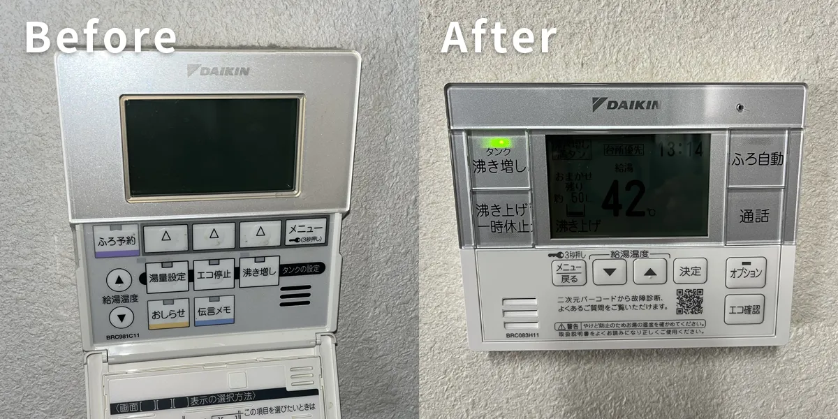 旧型のものはカバーを外さないと細かい操作はできませんでしたが、新しいリモコンなら沸き増しやメニュー操作もワンタッチに。