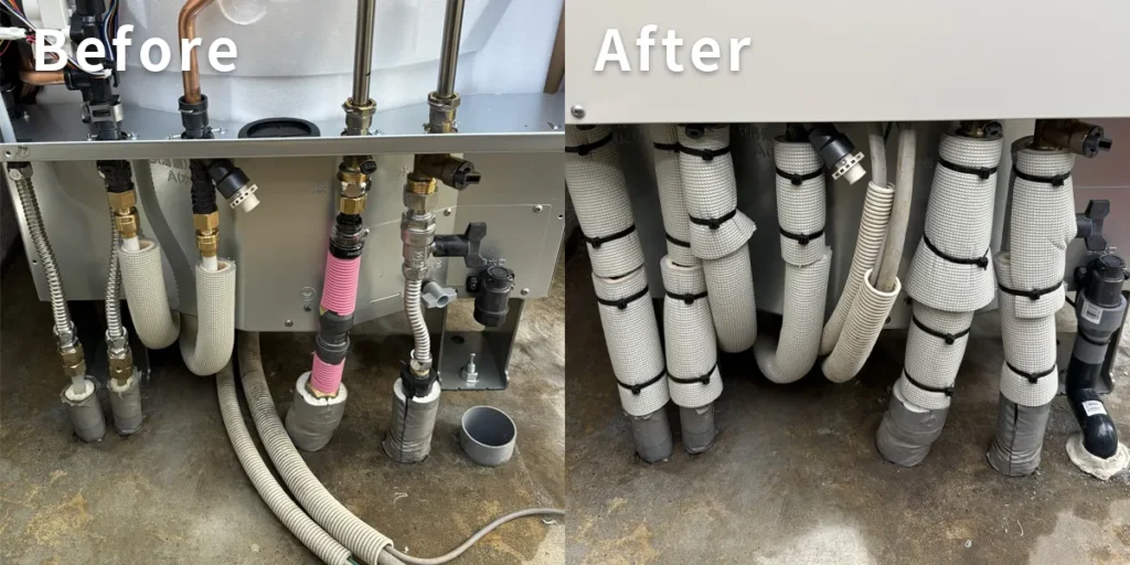 経年による劣化や配管がむき出しの状態で性能が低下してしまっていましたが、新しい部品に取り替えた上で配管カバーで覆い、しっかりと保護してあります。