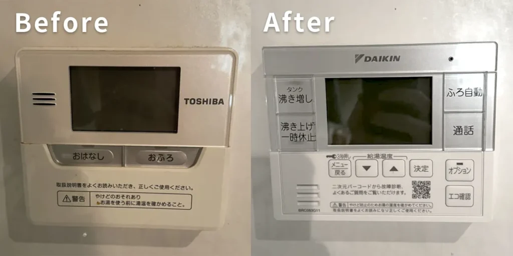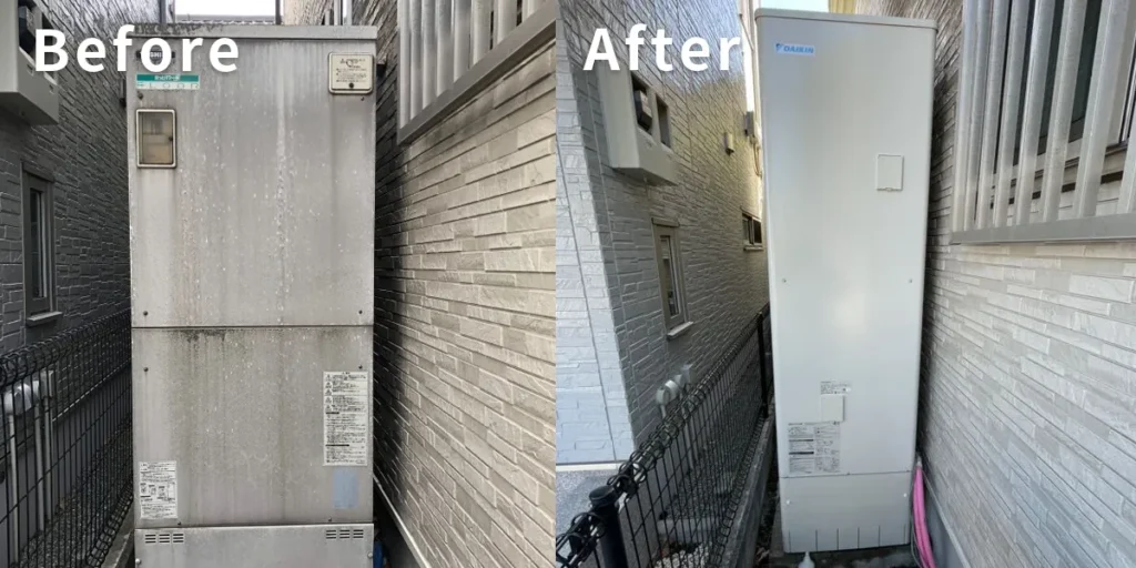 長年お使いの東芝製の角型エコキュート【HPE-FBD464HT】から、ダイキン製の角型エコキュート【EQX46YFV】へのお乗り換えです。