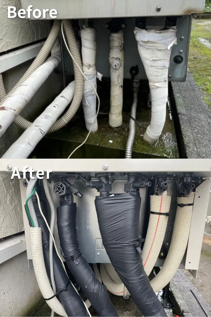 エコキュートの周辺配管部分も、新しい部品に取り替えて、この通り綺麗に施工いたしました。