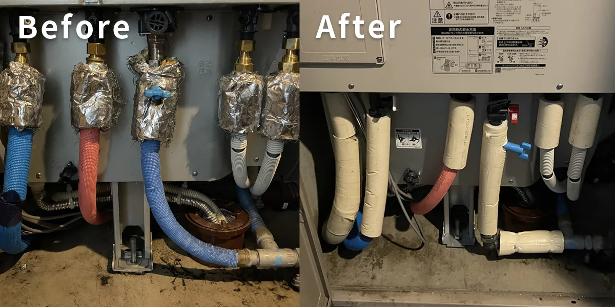 以前はアルミのようなものが巻かれ、配管のカバーとしてはちょっと心もとない印象…。